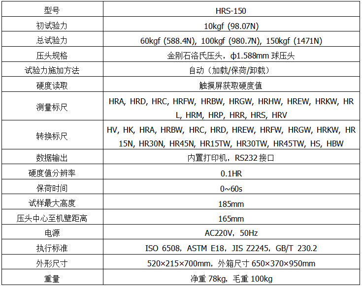 HRS-150数显洛氏硬度计采用全新的高分辨率彩色触摸屏,高亮度显示,具备中文界面,简单易懂。设备具有良好的可靠性、可操作性和直观性,是集机电于一体的高新技术产品。可显示和设置当前测试标尺、试验力、测试压头、保荷时间、硬度转换值、压头类型等,其主要功能如下:洛氏硬度标尺的选择;各硬度标尺之间的换算;显示屏背光可调、具备节能模式;实时数据保存至文件夹,共6个数据文件夹,任意文件数据可选删除、打印输出;硬度测试结果实时保存,自动计算最大、最小、平均值;操作界面直观清晰,使用方便;配有RS232接口供用户连接电脑输出。