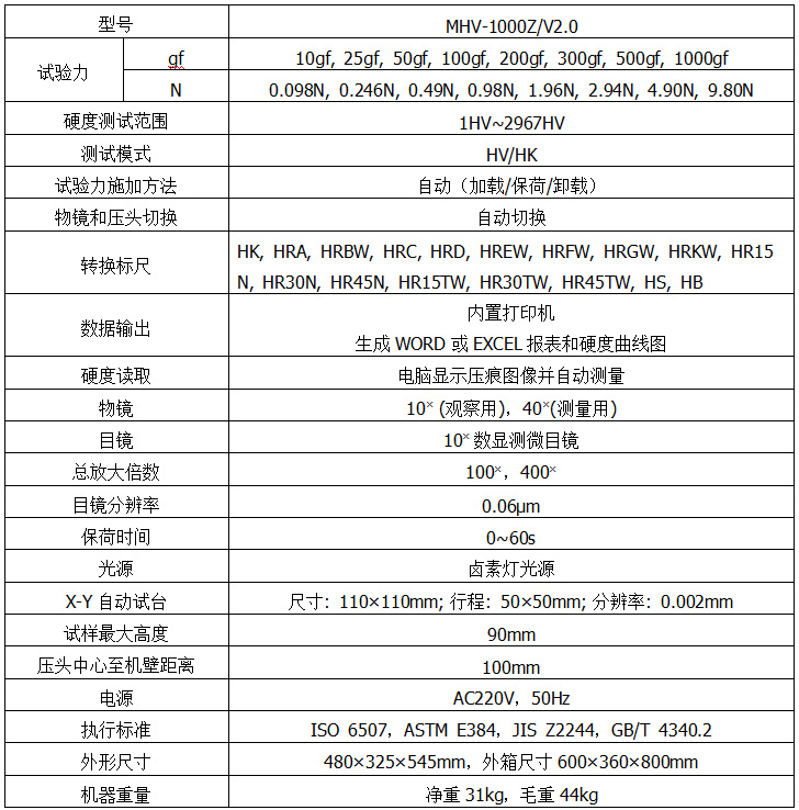 MHV-1000Z/V2.0自动显微维氏硬度计,集成了光学成像、机械位移、电子控制、数字成像、图像分析、计算机处理等多种专业新技术,通过计算机主机实现对维氏硬度计和自动载物台的控制,并将硬度压痕数字化成像在计算机屏幕上,再通过自动读数、手动读数等手段,准确测量金属及部分非金属材料及各种膜层、镀层的显微硬度、硬化层深度、膜层厚度、两点间距等。还可拍摄金属表面形貌并进行固定倍率打印等。这一系统,突破了传统硬度的测试方式,实现了半自动、高精度、高重复性的硬度测试,是材料分析的重要设备。